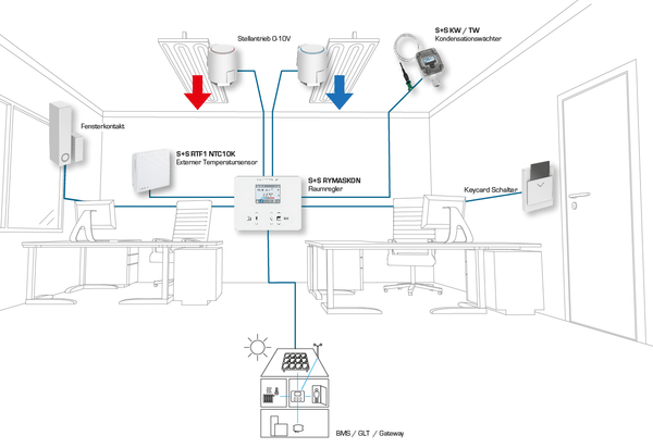 RYMASKON® dispose de capteurs pour mesurer la température, l'humidité et la qualité de l'air afin de vérifier l'état actuel de la pièce. Les modules de commande de pièce contrôlent le chauffage, le refroidissement, la ventilation, l'ombrage et l'éclairage via une communication Modbus avec la GTC.