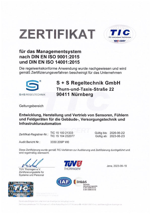 S+S Regeltechnik a obtenu la certification ISO 14001 en juin 2023 et répond ainsi aux normes internationales reconnues en matière de gestion durable de l'environnement. Cette certification confirme notre engagement en faveur de la protection de l'environnement, de la réduction des impacts environnementaux et de l'amélioration continue de nos processus liés à l'environnement. C'est avec fierté que nous contribuons à construire un avenir durable pour les générations futures.