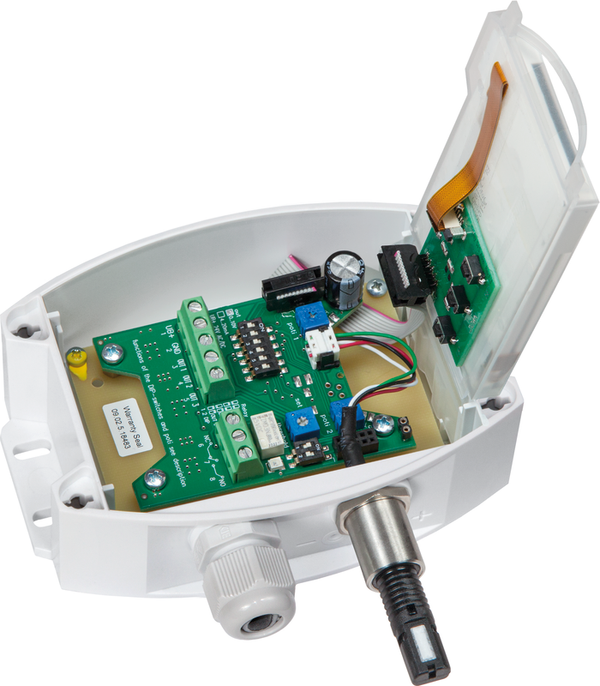| Sonde en saillie HYGRASREG® AFTF-45 avec capteur étanche (IP 65), avec sortie active et tout ou rien, boîtier en plastique résistant aux chocs avec vis à fermeture rapide, presse-étoupe, filtre fritté en plastique, au choix avec ⁄ sans écran, pour la saisie de l'humidité relative (0...100 % RH) et de la température (4 plages de mesure commutables, max. 0...+100 °C) ainsi que pour la détermination de diverses grandeurs caractéristiques de la technique de mesure de l'humidité. Le convertisseur de mesure convertit les grandeurs mesurées en un signal normalisé de 0 - 10 V ou 4...20 mA. L'appareil est spécialement conçu pour être utilisé dans des conditions ambiantes difficiles (95...99 % RH). Il utilise un capteur numérique d'humidité et de température stable à long terme et très étanche (IP 65 scellé). Les grandeurs caractéristiques suivantes sont calculées en interne à partir de ces mesures et peuvent être appelées via la sortie OUT3 : humidité absolue, rapport de mélange, point de rosée et température de bulbe humide (modifiable via le commutateur DIP). Sur la variante de l'appareil AFTF-45 LCD, jusqu'à trois grandeurs caractéristiques peuvent être affichées à l'écran (réglable par commutateur DIP). La sonde est utilisée dans la technique médicale, la technique du froid, la technique de régulation, la technique de climatisation et de salle blanche. La sonde est calibrée en usine, un réglage fin en fonction de l'environnement peut être effectué par un spécialiste. |