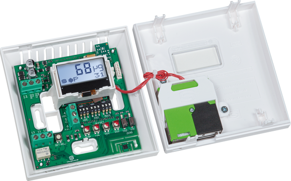 Capteur de climat intérieur multifonctionnel et sans entretien AERASGARD® - LE CAPTEUR DE TEMPÉRATURE RFTM - PS - CO2 - W avec sortie active/à commutation, étalonnage automatique, dans un boîtier plastique esthétique avec couvercle à encliqueter, partie inférieure avec fixation à 4 trous, au choix avec/sans affichage, pour la saisie des grandeurs de mesure humidité de l'air (0...100 % RH), température (0...+50°C), poussières fines (PM) (0...50 / 100 / 300 / 500 μg/m³) et teneur en CO2 (0...2000 / 5000 ppm). Le convertisseur de mesure convertit la grandeur mesurée en un signal normalisé de 0-10 V ou 4...20 mA (commutable).