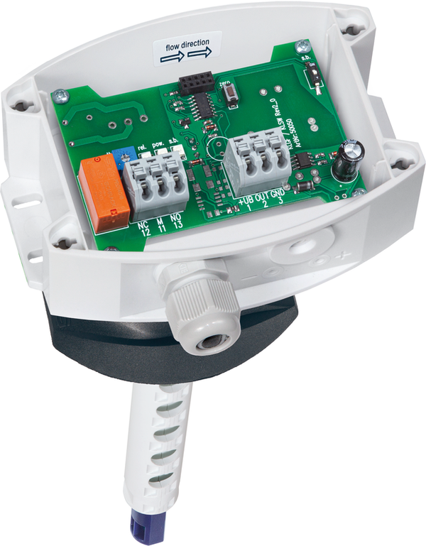 Contrôleur électronique de débit d'air de gaine RHEASREG® (SYSTÈME D'ALARME) KLSW avec sortie tout ou rien, boîtier en plastique résistant aux chocs avec vis à fermeture rapide, avec presse-étoupe, au choix avec ⁄ sans écran, pour déterminer la vitesse d'écoulement (0,1...20 m/s).