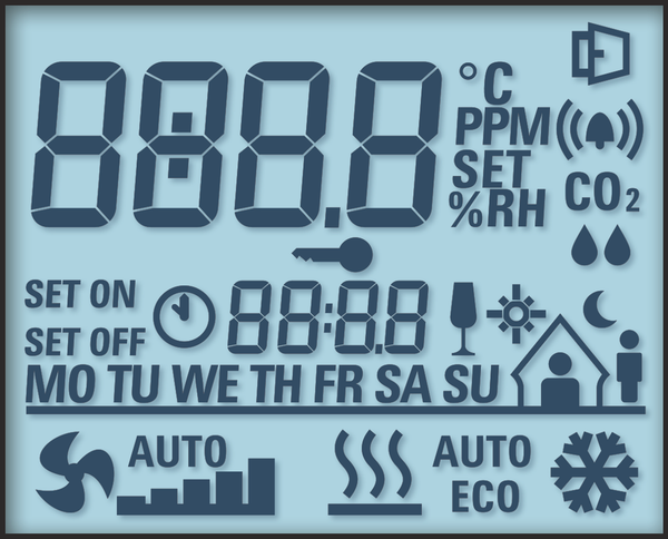 L'écran multifonctionnel spécialement conçu pour la commande de la pièce est graduable et offre un affichage clair de toutes les données disponibles de la pièce au moyen de symboles intuitifs. Outre l'heure, le jour de la semaine et les paramètres climatiques (température, humidité, point de rosée, teneur en CO2), il est également possible d'afficher d'autres fonctions, telles que le mode chauffage/refroidissement et ventilateur, fenêtre ouverte, éclairage, alarme, verrouillage des touches ou occupation des pièces.