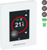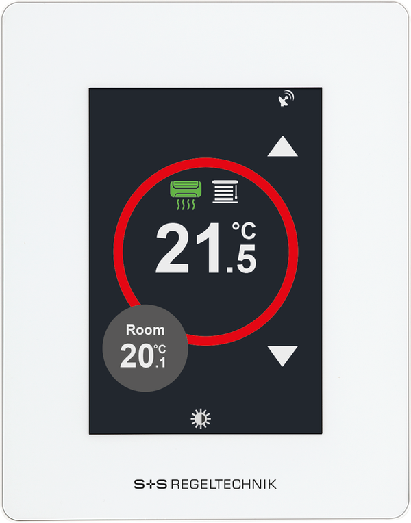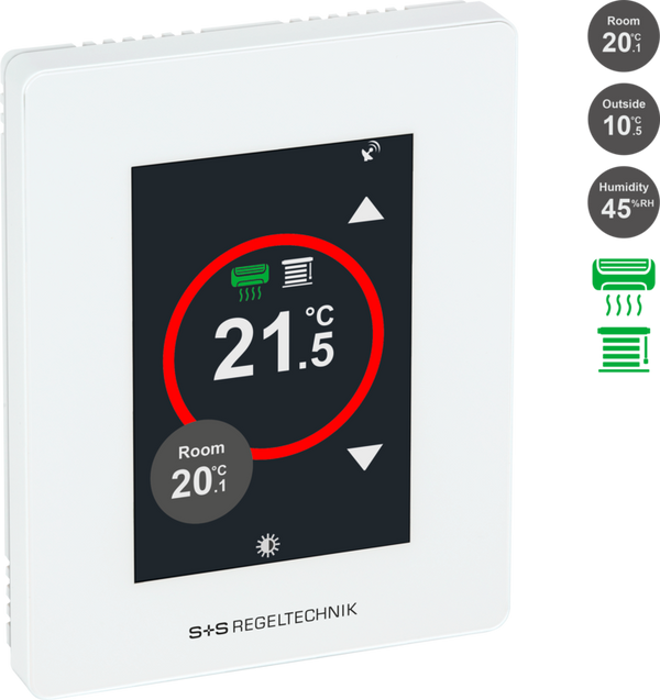 Le modèle de base RYMASKON 510 Thermostat avec écran tactile couleur (3,5"), dans un boîtier blanc, dispose d'un capteur de température et d'humidité intégré, de 2 entrées de résistance (pour capteurs de température externes NTC10K), d'une entrée numérique, d'une sortie de relais (7A) et, au choix, d'une connexion Modbus ou BACnet. Les modules de commande de pièce servent à commander le chauffage/refroidissement directement via le relais (régulation à 2 points) ainsi que l'éclairage, la climatisation et la protection solaire (1 zone) via le bus.