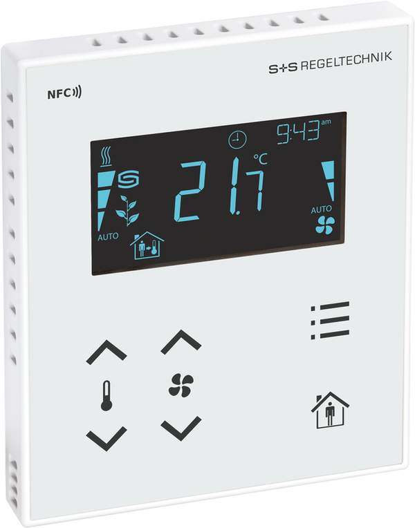 L'écran multifonctionnel spécialement conçu pour la commande de la pièce est graduable et offre un affichage clair de toutes les données spatiales disponibles au moyen de symboles intuitifs. Outre l'heure, la date et les paramètres climatiques (température, humidité, point de rosée, teneur en CO2), d'autres fonctions telles que le fonctionnement du ventilateur ou l'occupation de la pièce peuvent être affichées. La couleur du rétroéclairage peut être adaptée au design de la pièce.