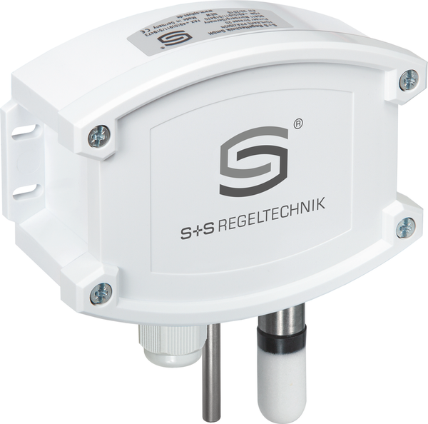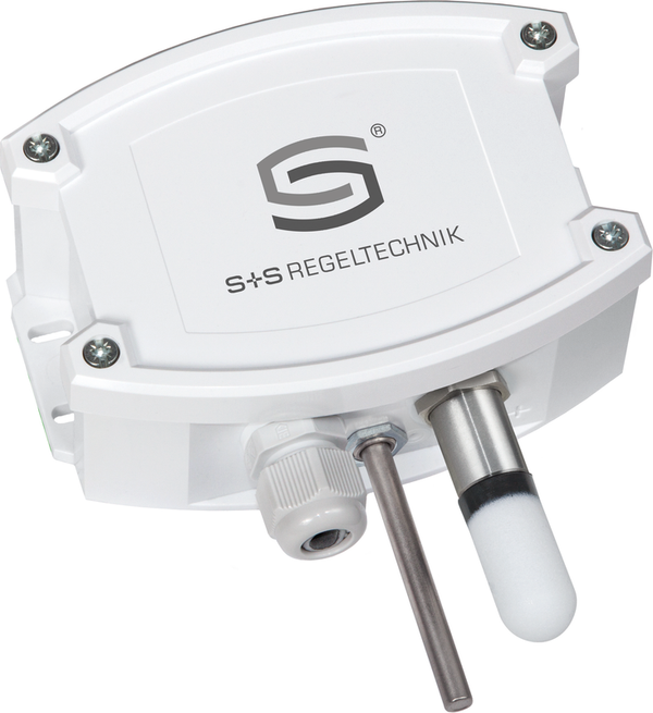 Sonde en saillie HYGRASREG® AFTF-35 protégée contre la condensation avec sortie active et tout ou rien, boîtier en plastique résistant aux chocs avec vis à fermeture rapide, presse-étoupe, filtre fritté en plastique (échangeable), au choix avec ⁄ sans écran, pour la saisie de l'humidité relative (0...100 % RH) et de la température (4 plages de mesure commutables, max. 0...+100 °C) ainsi que pour la détermination de diverses grandeurs caractéristiques de la technique de mesure de l'humidité. Le convertisseur de mesure convertit les grandeurs mesurées en un signal normalisé de 0 à 10 V ou de 4 à 20 mA.