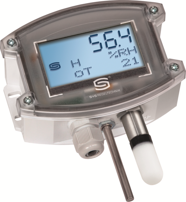 Sonde en saillie HYGRASREG® AFTF-35 protégée contre la condensation avec sortie active et tout ou rien, boîtier en plastique résistant aux chocs avec vis à fermeture rapide, presse-étoupe, filtre fritté en plastique (échangeable), au choix avec ⁄ sans écran, pour la saisie de l'humidité relative (0...100 % RH) et de la température (4 plages de mesure commutables, max. 0...+100 °C) ainsi que pour la détermination de diverses grandeurs caractéristiques de la technique de mesure de l'humidité. Le convertisseur de mesure convertit les grandeurs mesurées en un signal normalisé de 0 à 10 V ou de 4 à 20 mA.