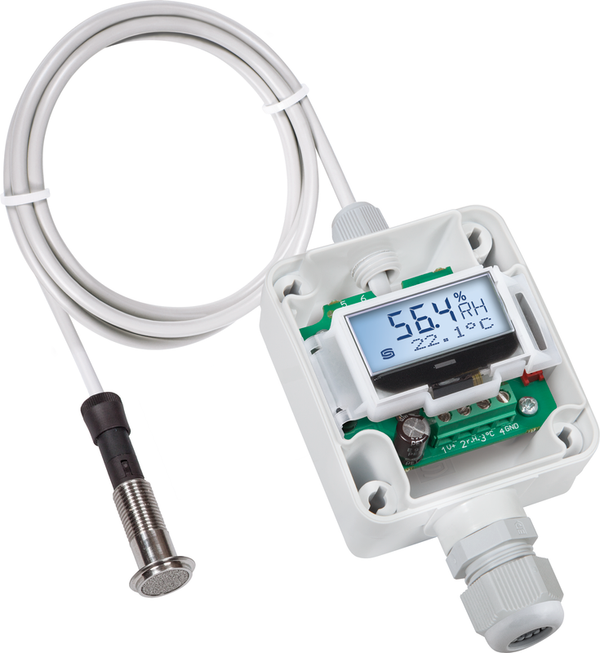 Le transmetteur d'humidité et de température étalonnable HYGRASGARD® EST VFF/VFTF mesure l'humidité relative et la température de l'air. Il convertit les grandeurs de mesure de l'humidité et de la température en un signal normalisé de 0-10 V ou 4...20 mA et est disponible au choix avec⁄sans écran. Il dispose de quatre plages de température commutables. L'humidité relative (% RH) est le quotient de la pression partielle de vapeur d'eau et de la pression de vapeur saturante à la température du gaz correspondant. Les convertisseurs de mesure sont destinés à la saisie exacte de la température et de l'humidité. Une sonde numérique, stable à long terme, est utilisée comme élément de mesure pour l'humidité et la température. Le capteur est étalonné en usine, un réglage fin par un spécialiste en fonction de l'environnement est possible.