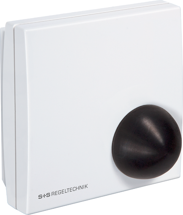 Sonde à résistance THERMASGARD® RSTF avec sortie passive, dans un boîtier esthétique en plastique, avec couvercle à encliqueter, partie inférieure avec fixation à 4 trous, pour montage sur des boîtes d'encastrement installées verticalement ou horizontalement, avec point destiné à la rupture pour raccordement en saillie, qui sert spécialement à détecter la température dans les grands locaux.